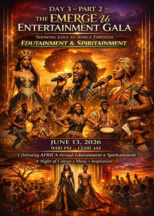 The EMERGE Us Entertainment Gala is a powerful evening dedicated to showing love and gratitude to Africa through Edutainment and Spiritainment — where education, entertainment, and spiritual expression meet in excellence.